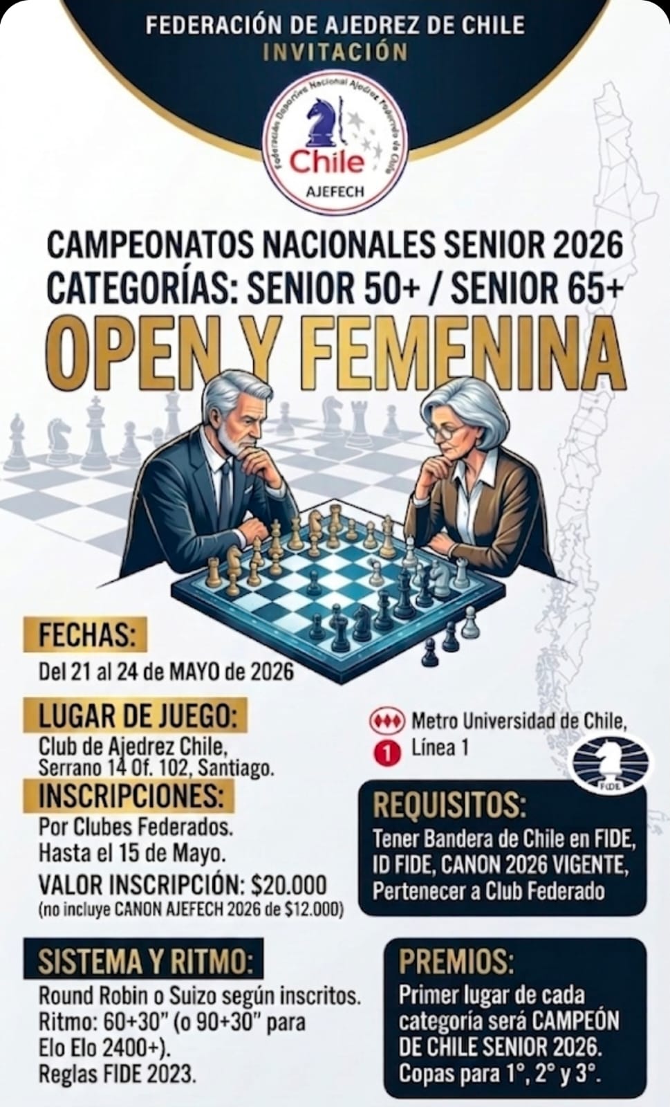 La Federación de Ajedrez de Chile tiene el agrado de invitar a todos los deportistas del país, que cuenten con bandera de Chile en la FIDE, a participar de los Campeonatos Nacionales Senior, Categorías 50 + y 65+, en Open y Femenina 2026, que se realizará en la ciudad de Santiago de Chile del 21 al 24 de mayo de 2026.