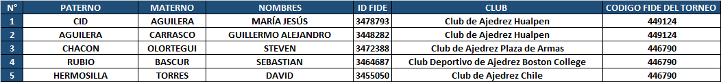 f) En caso de no asistir alguna de las 5 jugadoras mencionadas en los puntos anteriores o bien alguna jugadora no cumpla con los requisitos del punto e), se designarán los cupos restantes de acuerdo a los mejores puntajes ELO del listado Elo FIDE del 1° de abril de 2026. Se considerarán para este efecto las 8 mejores jugadoras Activas de la lista y que cumplan con el requisito expresado en el punto e) de este reglamento.