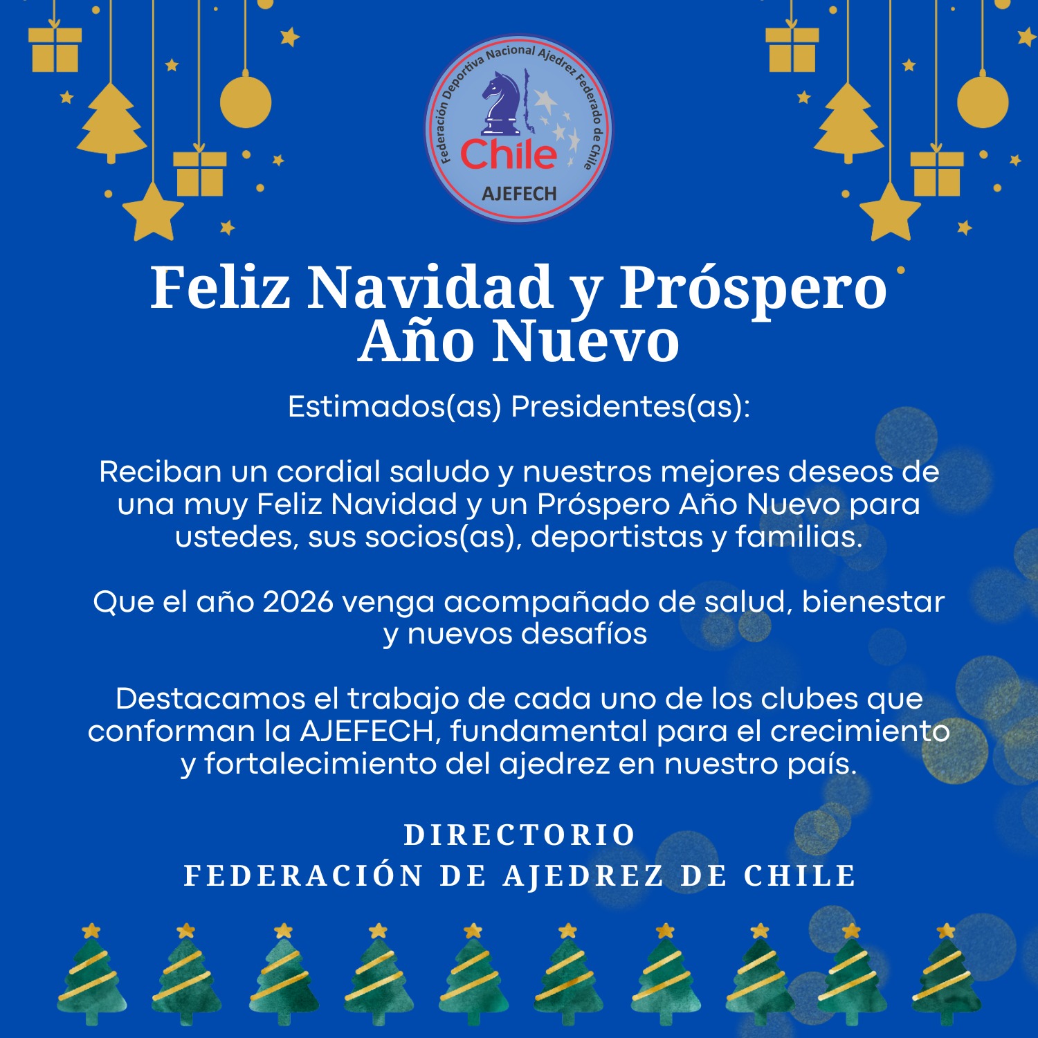 La Federación de Ajedrez de Chile informa a toda la comunidad, y en especial a los Árbitros y Administradores de Rating, que a contar del 1 de enero de 2026, es requisito indispensable tener el Canon 2026 al día para poder registrar y publicar torneos o actividades en la plataforma oficial de ajedrez.
