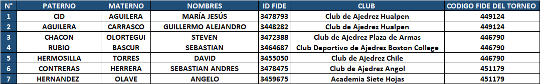 f) En caso de no asistir alguno de los 5 jugadores mencionados en los puntos anteriores o bien algún jugador no cumpla con los requisitos del punto e), se designarán los cupos restantes de acuerdo a los mejores puntajes ELO del listado Elo FIDE del 1° de abril de 2026. Se considerarán para este efecto los 8 mejores jugadores ACTIVOS de la lista y que cumplan con el requisito expresado en el punto e) de este reglamento.
