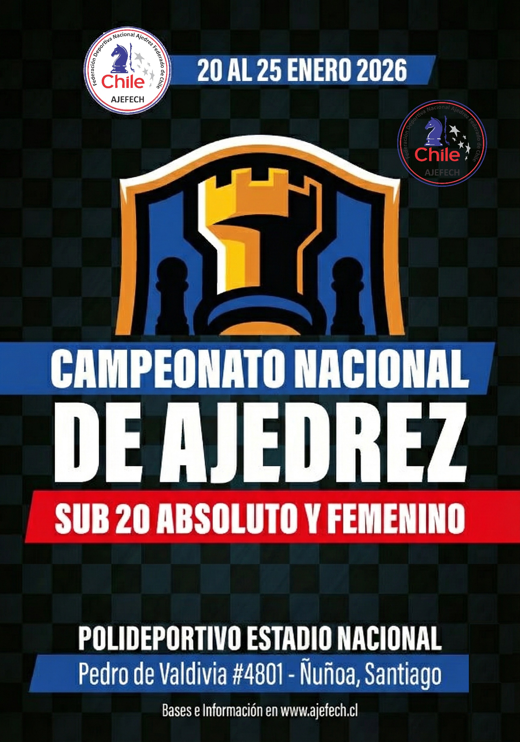 La Federación Deportiva Nacional Ajedrez Federado de Chile - FDN (AJEFECH - FDN), con el apoyo de Instituto Nacional de Deportes invitan a todos los ajedrecistas del país, a participar de los Campeonatos Chilenos de Ajedrez Juvenil 2026 (categoría menor de 20 años) que se realizarán desde el martes 20 al domingo 25 de enero de 2026 en el Polideportivo Estadio Nacional ubicado en Avenida Pedro de Valdivia Nº 4801, Ñuñoa, Santiago. Estación de Metro Estadio Nacional. Línea 6.