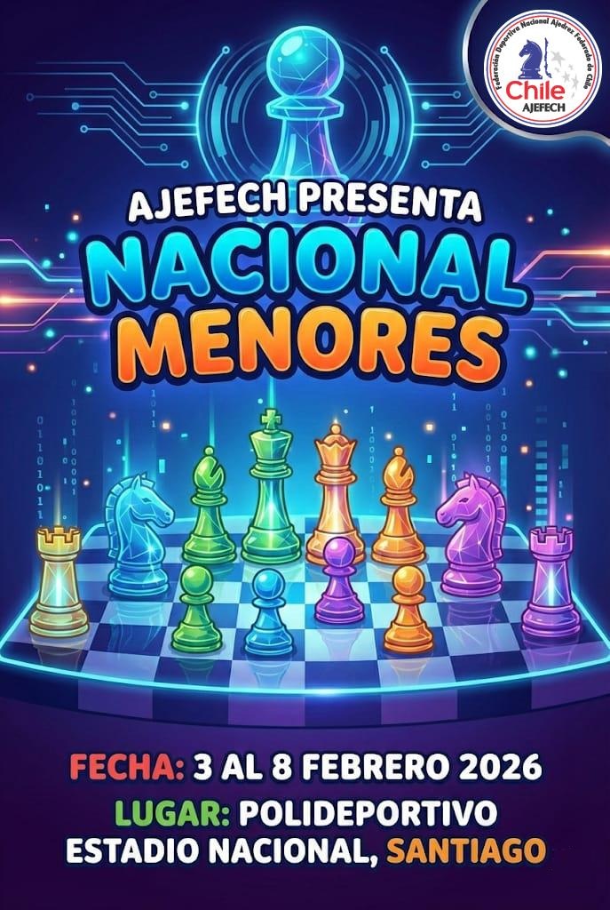 La Federación Deportiva Nacional Ajedrez Federado de Chile - FDN (AJEFECH - FDN), con el apoyo de Instituto Nacional de Deportes invitan a todos los ajedrecistas del país, a participar de los Campeonatos Chilenos de Ajedrez 2026 para las categorías Sub 08 hasta Sub 18 que se realizarán entre el 03 al 08 de febrero de 2026 en el Polideportivo Estadio Nacionalubicado en Avenida Pedro de Valdivia Nº 4801, Ñuñoa, Santiago. Estación de Metro Estadio Nacional. Línea 6.