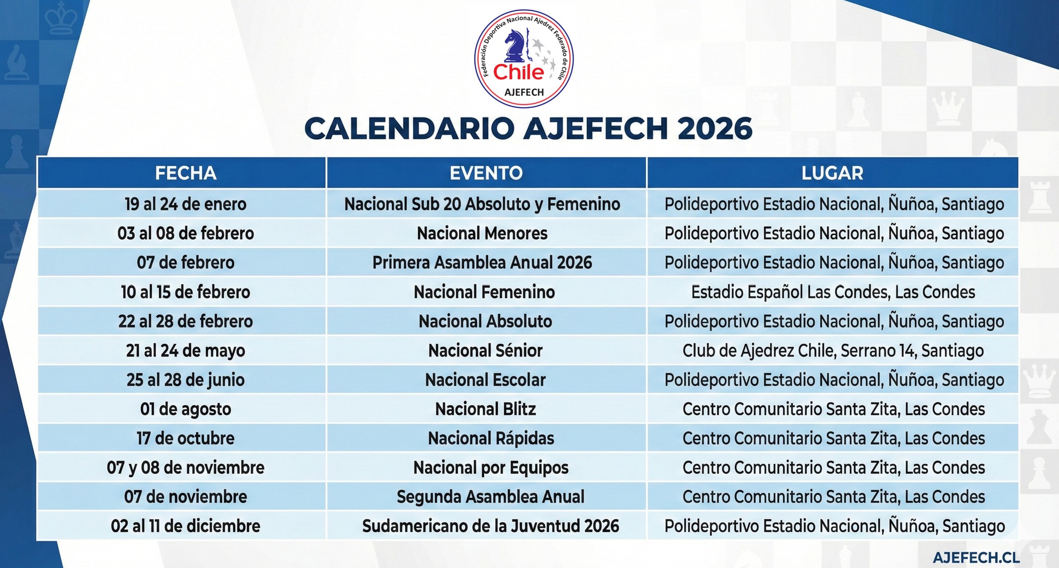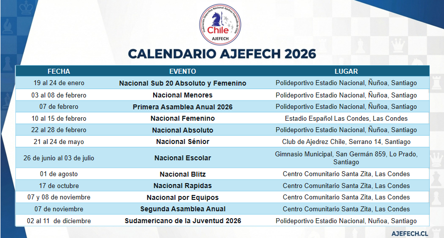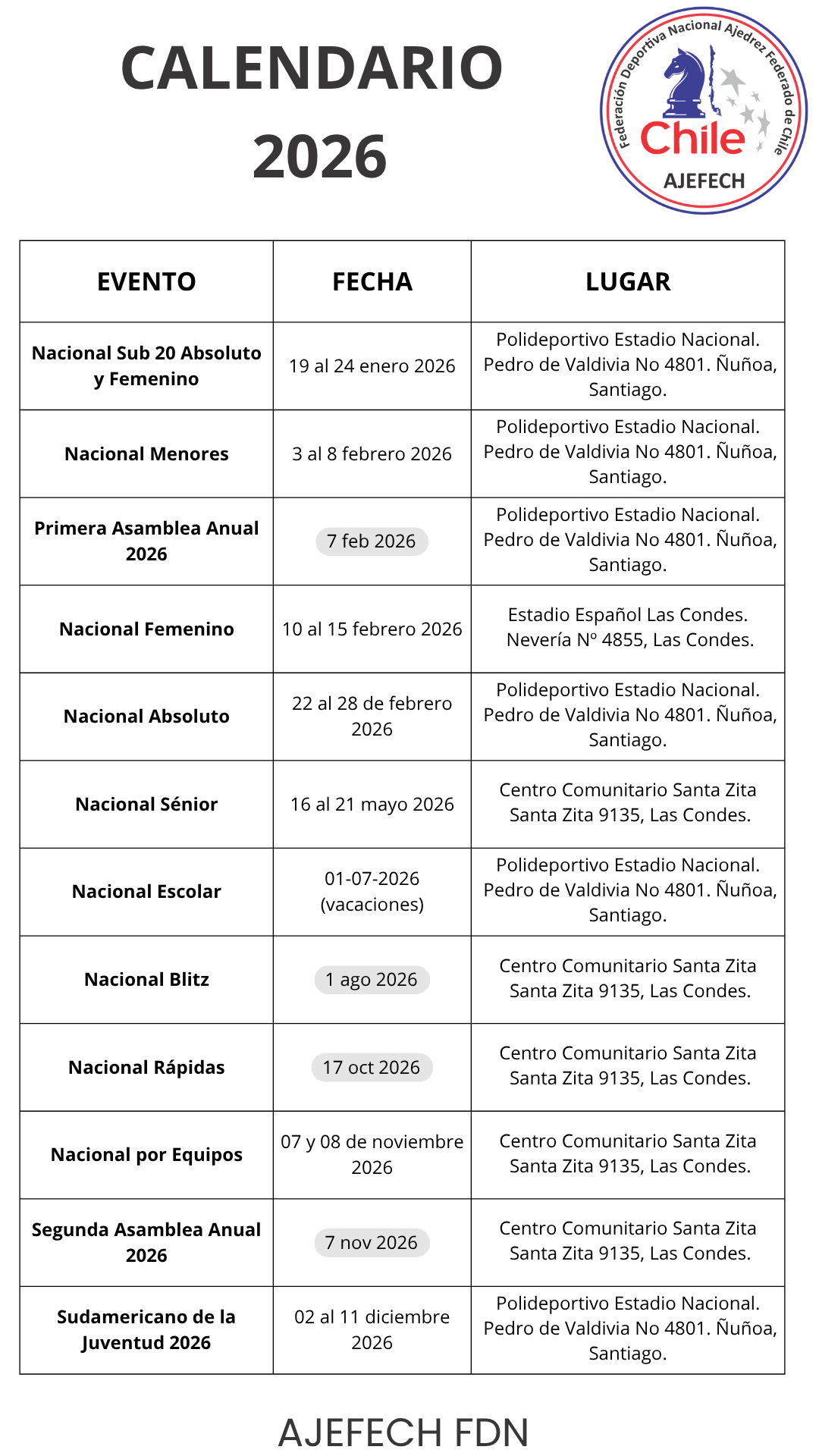 Calendario general de Torneos y Eventos a nivel Nacional e Internacional para el año 2026