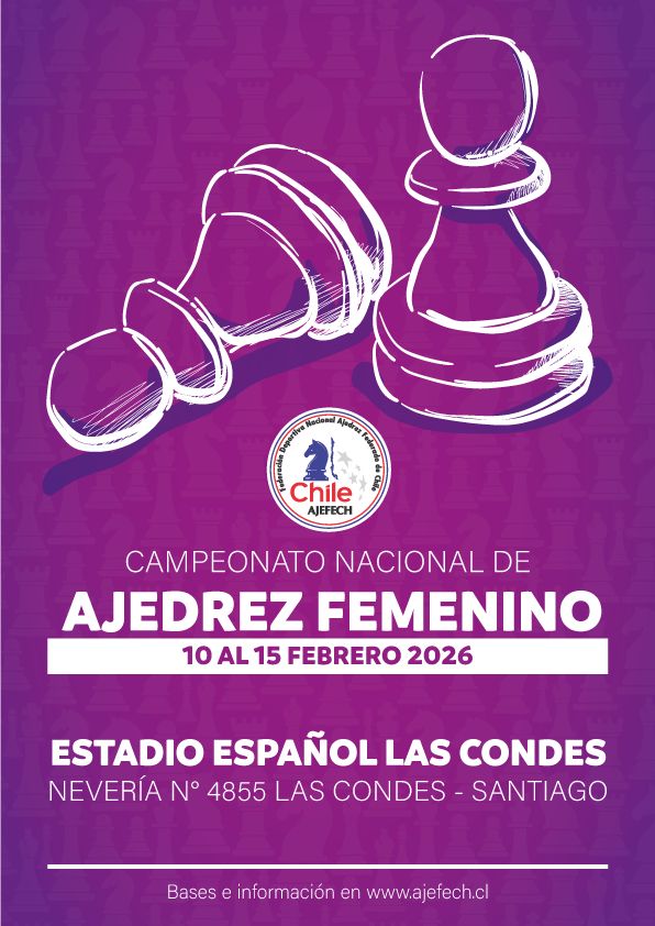 La Federación Deportiva Nacional Ajedrez Federado de Chile (AJEFECH), con el apoyo del Estadio Español de Las Condes, informa que se encuentran abiertas las inscripciones para participar en la Final del Campeonato Nacional Femenino de Ajedrez 2026, evento que se realizará entre el 10 y el 15 de febrero 2026, en el Salón Isabel La Católica del Estadio Español de Las Condes, ubicado en Nevería Nº 4855, Las Condes, Santiago. Estación Metro Escuela Militar.